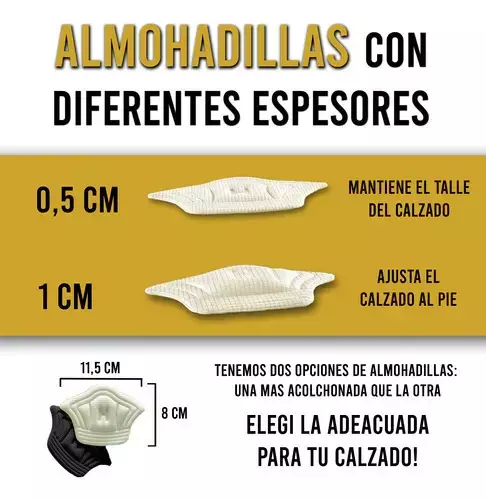 ? Disponibles en dos modelos: una de 0,5 cm de espesor y otra de 1 cm, para ajustar el calzado en caso de que quede un poco grande y mejorar la comodidad al caminar.